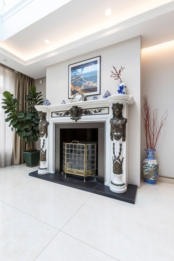 This Hendon project is a bright, contemporary open-plan living and dining space designed to feel expansive, clean and high-end. A crisp white envelope (gloss floor tiles, white walls and a recessed ceiling with layered LED lighting) creates a calm backdrop that maximises light and gives the home a sleek, gallery-like finish.